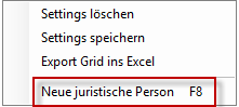 Die Garantenerfassung erfolgt unter der Grobnavigation Stammdaten im Detail Juristische Personen. Auf der Maske Suche juristische Person muss zuerst nach dem gewünschten Garanten gesucht werden, damit sichergestellt ist, dass der Garant nicht doch bereits vorhanden ist. Anschliessend mit F8 oder mit rechter Maustaste neue juristische Person einsteigen.