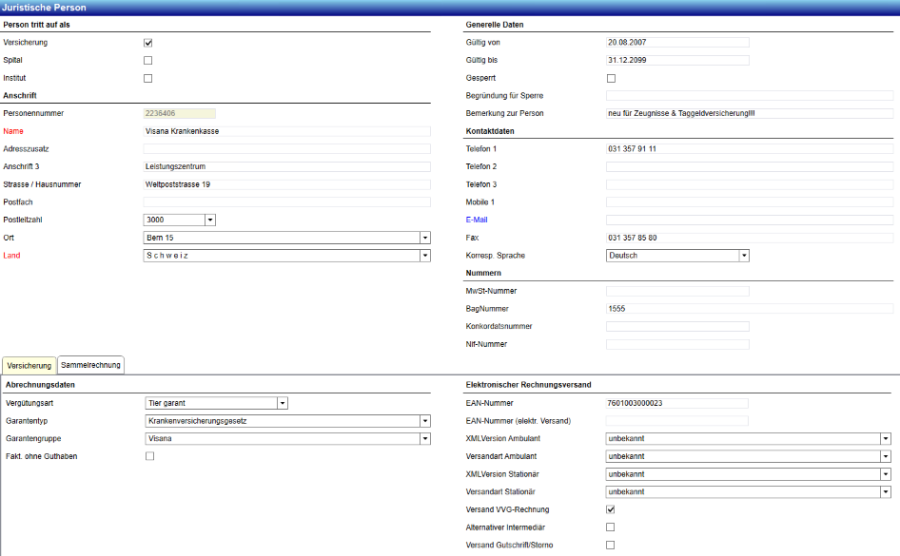 Falls der Rechnungsversand über eine andere Versicherung abgewickelt wird, dann muss die EAN-Nummer des elektronischen Rechnungsempfängers eingetragen werden, ansonsten leer lassen. |