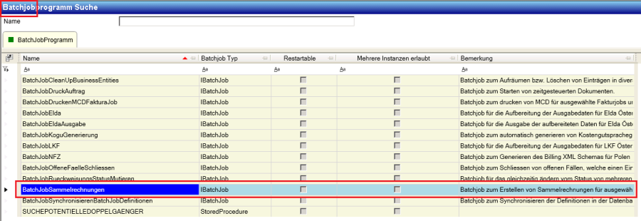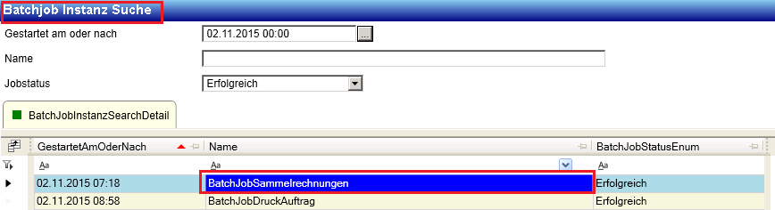 Die verarbeiteten Sammelrechnungen sind als 'BatchJob Instanz' unter der entsprechenden Suche in 'System' > 'Batchjobinstanz Suche' zu finden. (Siehe Screenshot unten)
