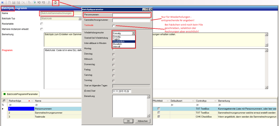 Der Batchjobparameter 'Testmode' kann dazu verwendet werden, einen Testlauf des Batchjobs auszuführen. Es wird dann eine Sammelrechnung erstellt, aber die Sammelrechnungsnummer des Debitors wird nach dem Lauf noch nicht erhöht.