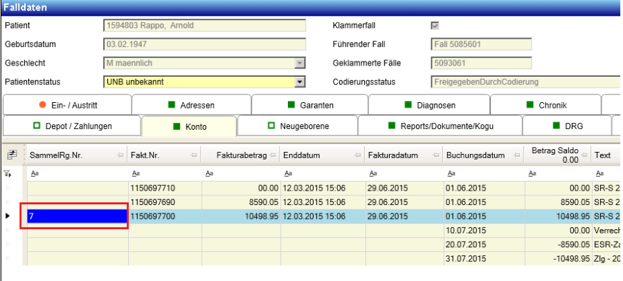 Die Sammelrechnungsnummer findet man beim Fall in der Kontobewegung. Sie steht im Feld 'SammelRg.Nr.'.
