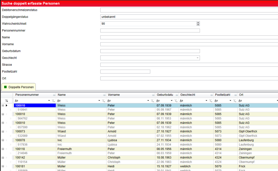 Unter «Stammdaten» -> «Doppelte Subjekte» können doppelte natürliche oder juristische Personen gesucht werden. Die Eingabe der Wahrscheinlichkeit bestimmt die Übereinstimmung der einzelnen Datensätze. Sollen mehrere Personen verschmolzen werden, muss dies nacheinander geschehen. Es können immer nur zwei natürliche / juristische Personen auf einmal verschmolzen werden.