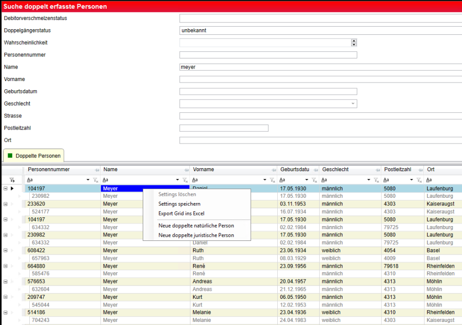 Zudem besteht die Möglichkeit, zwei Personen manuell zu verschmelzen. Dazu drückt man in der unten Auswahltabelle Rechtsklick und wählt den Eintrag «Neue doppelte natürliche Person» oder «Neue doppelte juristische Person» aus.