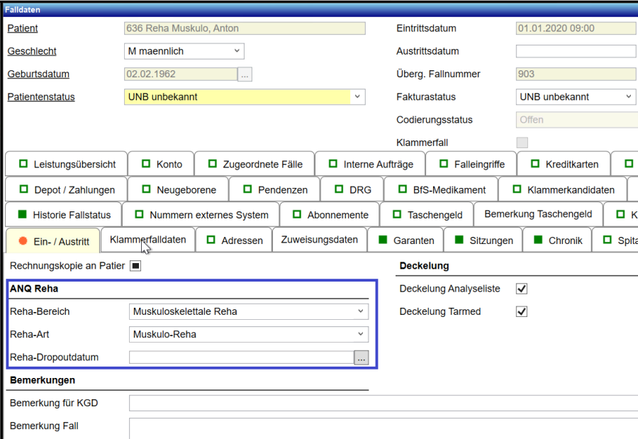 - Reha-Art und Reha-Bereich Für einen Reha-Fall können die Felder 'Reha-Art' und 'Reha-Bereich' erfasst werden.