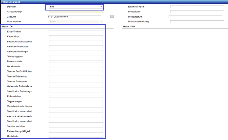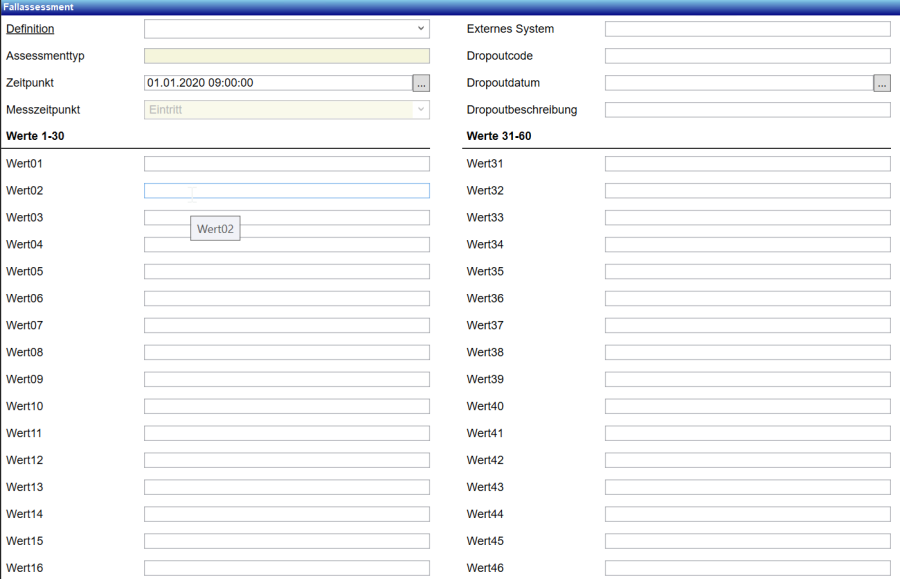 Soll ein neues Assessment zu einem Fall erfasst werden, dann wird zunächst ein leeres Assessment ohne weitere Angaben und mit allen theoretische verfügbaren aber noch unbeschrifteten Feldern / Merkmalen angezeigt.