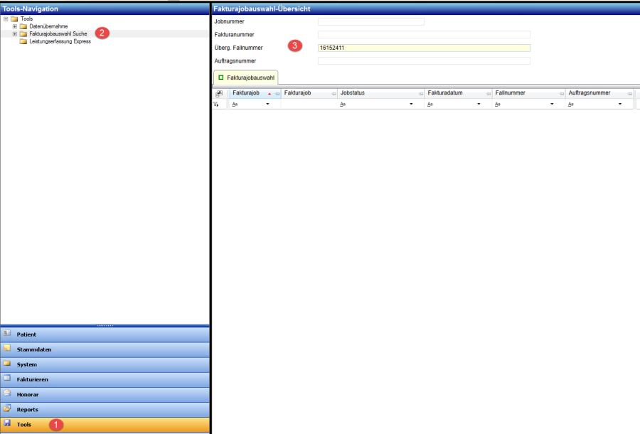Jede Nacht findet eine Bewertung der nicht fakturierten Leistungen oder geänderten Fälle statt. In NEXUS / PATNG ist das ein Fakturjob mit der Jobnummer 0. Dieser hat eine Startzeit, welche über das Programsetting «StartZeitNaechtlicheBewertung» gesteuert werden kann. Standardmässig ist hier 00:05:00 hinterlegt. Wenn Fakturjobs aus der Fakturierung laufen, so kann sich die Startzeit entsprechend nach hinten verschieben. Als Stichdatum wird dabei immer der Vortag um 23:59:59 verwendet. Zudem gibt es die Möglichkeit Job '0' nicht mehr nach einer bestimmten Uhrzeit zu starten. Auch das geschieht über ein Programsetting «Job0NichtMehrStartenNach». Hier empfehlen wir 05:00:00 Uhr, damit der Job nicht in den Tag hineinläuft. Beim Aufruf eines Falls im System wird dieser automatisch aus dem Job '0' gelöscht, da ansonsten nicht alle Mutationen am Fall durchgeführt werden können. Für Kontrollzwecke haben wir diverse Reports, mit denen man die Bewertung der Leistungen überprüfen kann. Wenn man die bewerteten Leistungen von Job '0' anschauen möchte, dann gibt es in der Applikation die Möglichkeit das über folgende Funktion zu machen. Tools → Fakturjobauswahl Suche