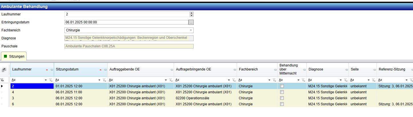 - Ob des zu demselben Patienten auf anderen Fällen Sitzungen und Leistungen gibt, die in die ambulante Behandlung fallen würden