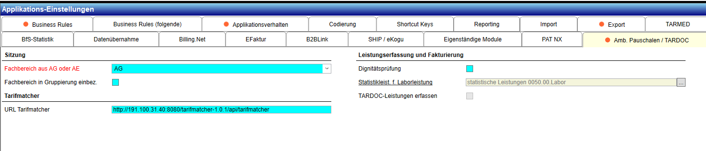 Hier wird die URL für den Aufruf des Tarifmatchers eingetragen. Ist hier nichts eingetragen, dann werden LKAAT-Leistungen direkt in TARDOC-Leistungen umgewandelt. - 'Statistikleist. f. Laborleistung'