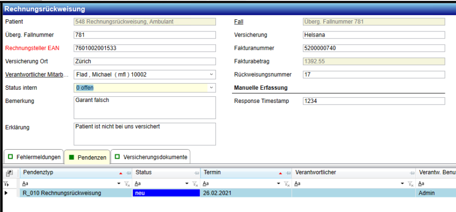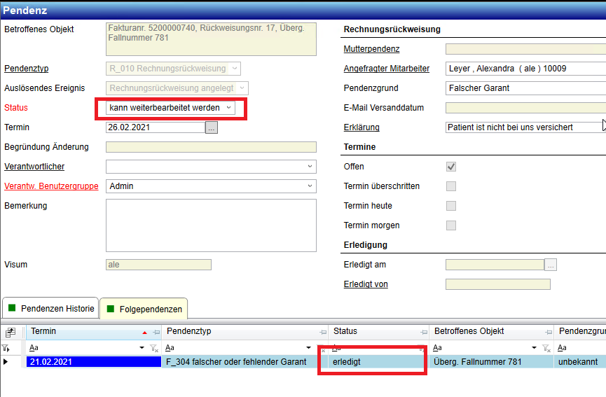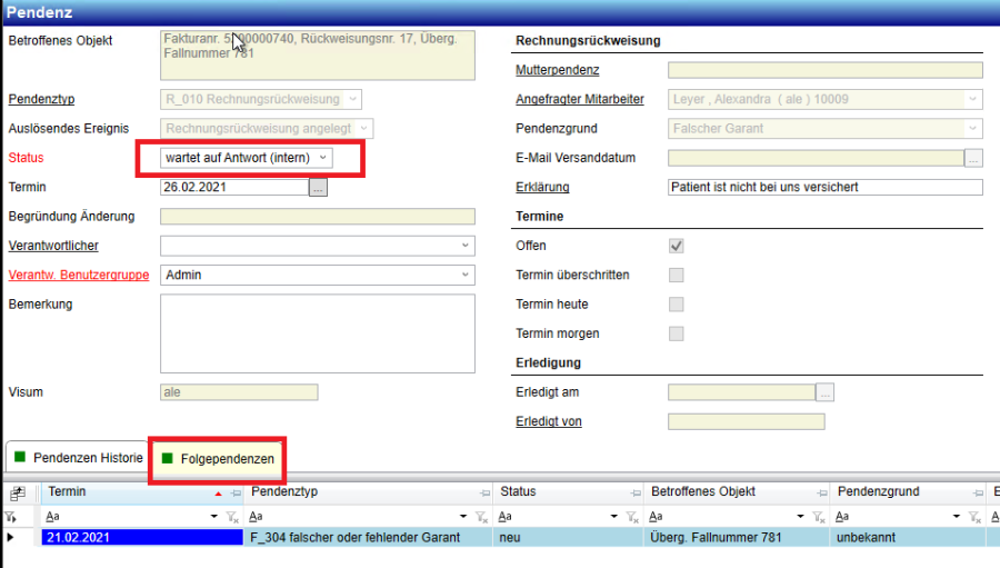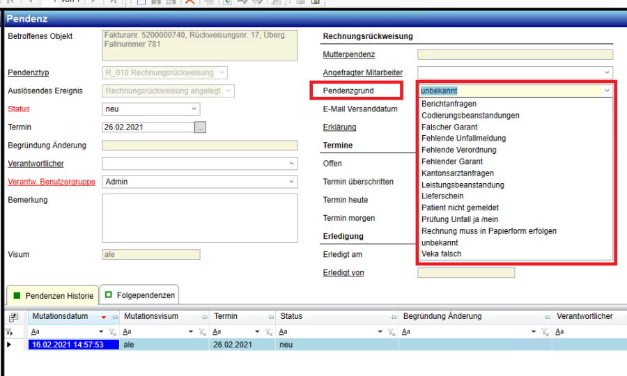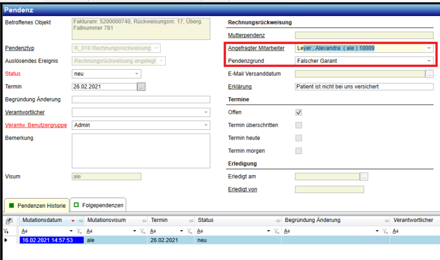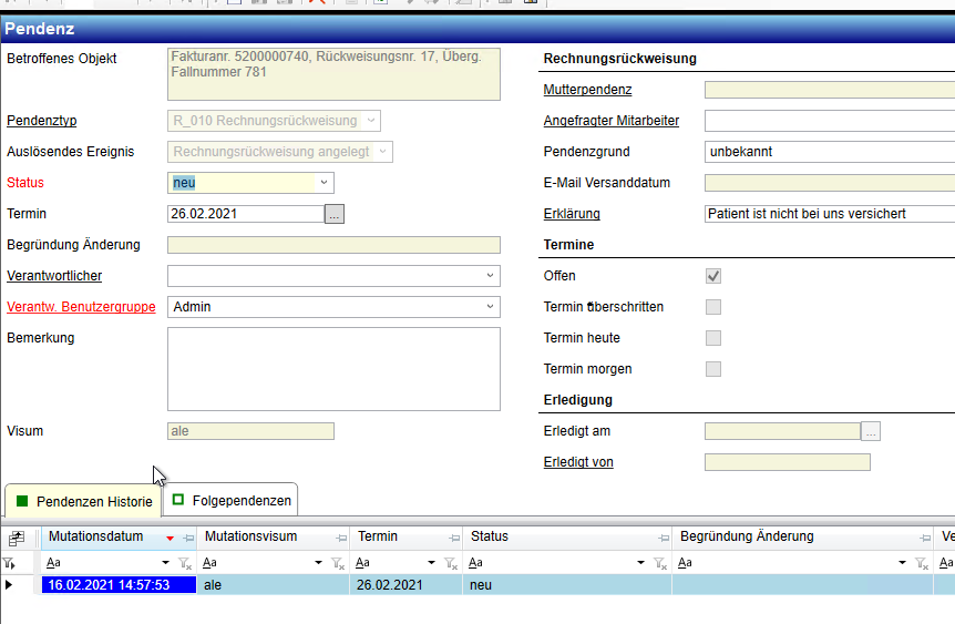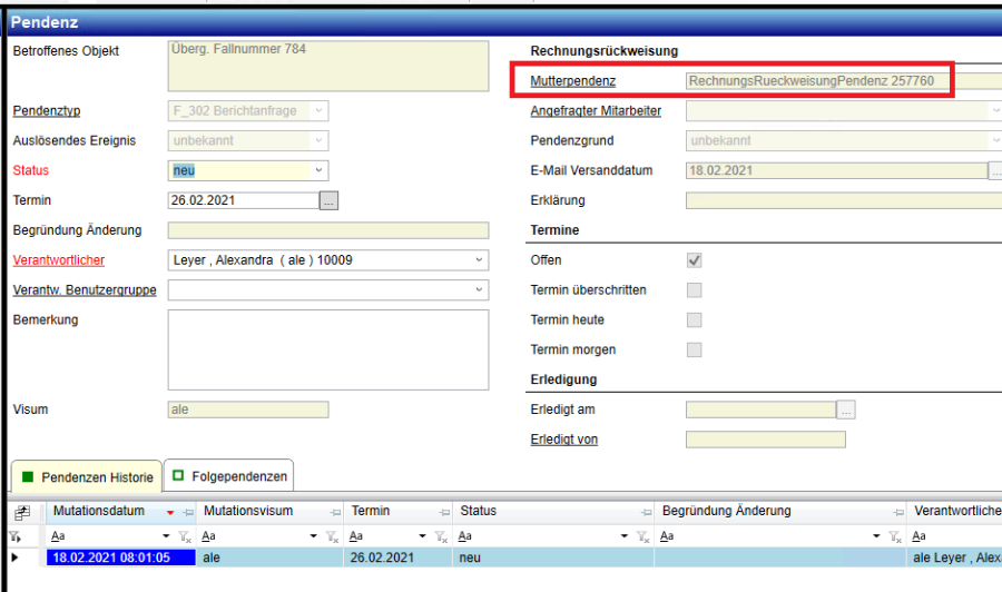 Anhand des Pendenzgrundes wird über die Entscheidungstabelle eine entsprechende Patienten- oder Fall-Pendenz für diesen Benutzer erstellt. Diese ist mit der Rechnungsrückweisungs-Pendenz verknüpft, im Feld 'Mutterpendenz' ist diese ersichtlich: