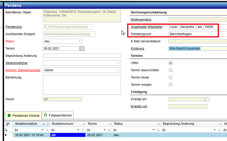 Abbildung 4 Angefragter Mitarbeiter und Pendenzgrund in Rechnungsrückweisungs-Pendenz