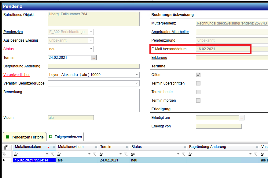 Abbildung 8 Pendenzgrund in Rückweisungspendenz, der Folgependenz und E-Mail auslöst