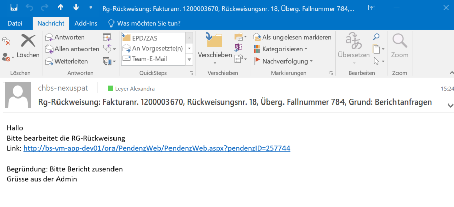 Abbildung 10 E-Mail aus Folgependenz der Rechnungsrückweisungs-Pendenz