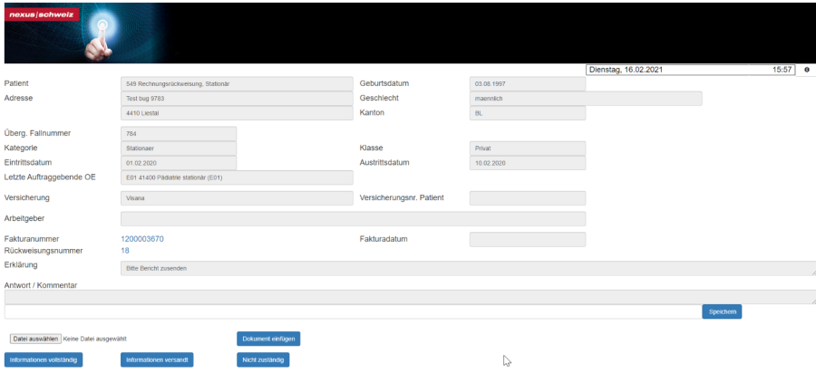 Der in der E-Mail mitgeschickte Link öffnet eine Web-Applikation zur Ansicht der Patienten / Falldaten und der Rechnungsdaten der zurückgewiesenen Rechnung, sowie die Rückweisungsnummer und die Begründung für die Rückweisung sowie den Fehlertext (soweit vorhanden) und die betroffene Versicherung oder den Kanton.