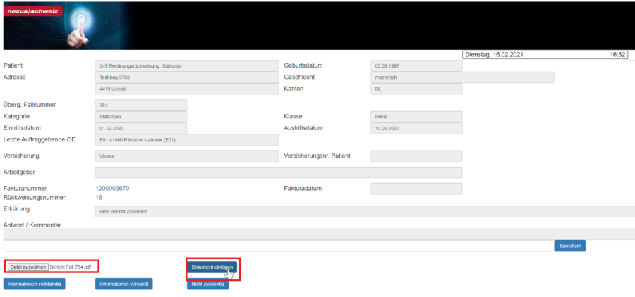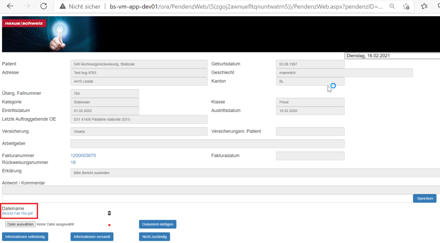 Sobald einer der Buttons ‚Informationen vollständig' oder ‚Informationen versandt' aktiviert wurde, werden die hinterlegten Dokumente in die Falldokumente in NEXUS / PATNG übernommen. Alle Status-Änderungen werden in der Pendenzhistorie dokumentiert.
