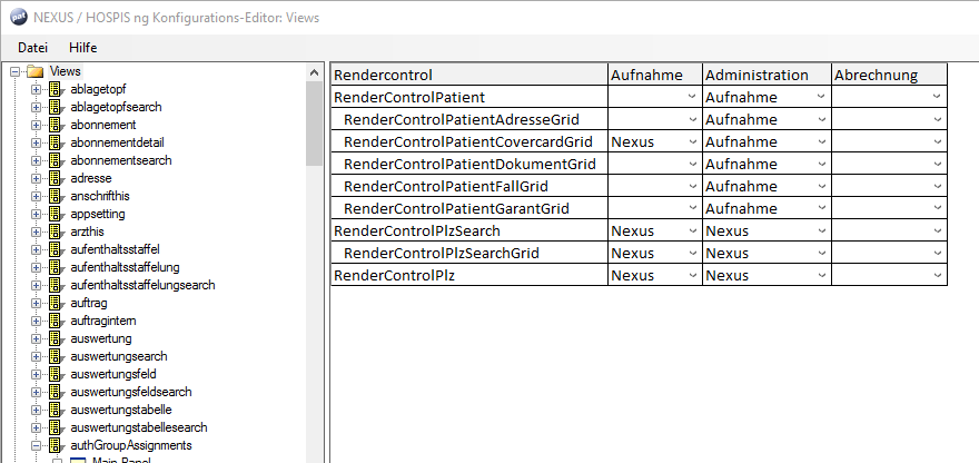 Für eine Übersicht und einfache Bearbeitung der vererbten Rendercontrols können alle Views (= Rendercontrol) mit den dazugehörenden Grid-Rendercontrols in einer Tabelle abgebildet werden (siehe Abbildung 10.2). Jede Spital-Konfiguration ist dann in einer Spalte abgebildet und kann so auf einfache Art und Weise bearbeitet werden.