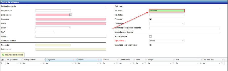 Alternativ kann auch in der Patienten-und Fallsuche nach der Fallnummer, oder einzelnen Fallkriterien gesucht werden. Wird die Fallnummer eingegeben, wird der Fall direkt geöffnet.