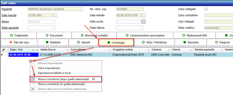 Dazu startet man auf dem Fall im Register «Chronik» und wählt per rechtsklick in der Tabelle den Kontextmenü-Eintrag «Neue Chronik (nach markierter Chronik)»: