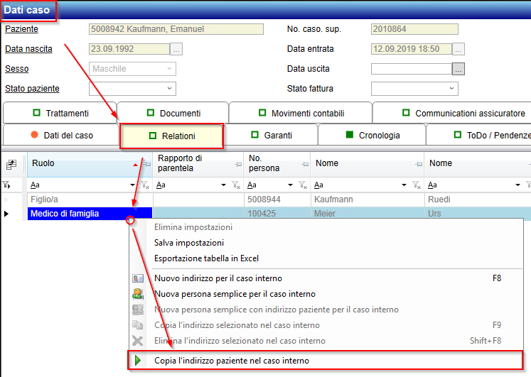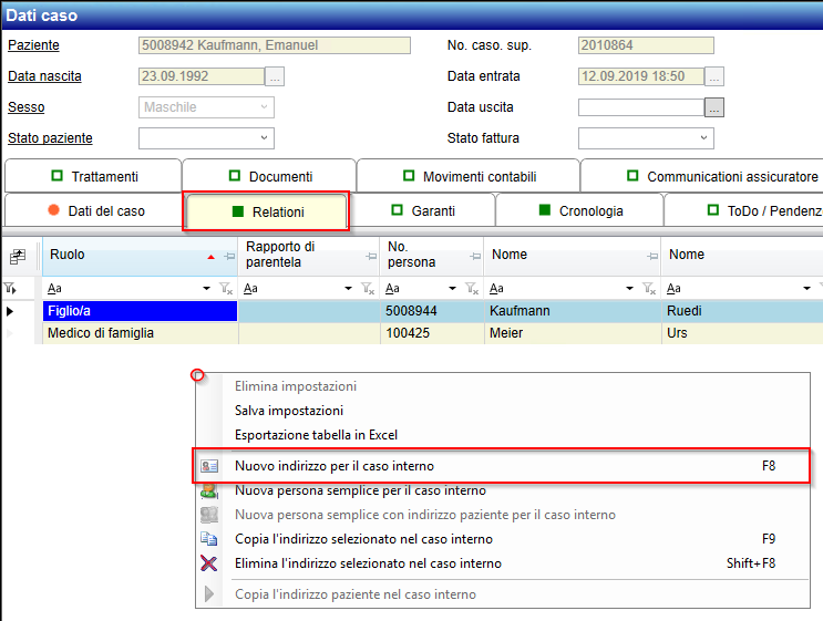 Um die effektiven «Falladressen» - sprich den Einweisenden und Behandelnden Arzt – zu erfassen, kann genau wie beim Patient auf der Fallebene über die rechte Maustaste den passenden Kontextmenüpunkt ausgewählt werden: