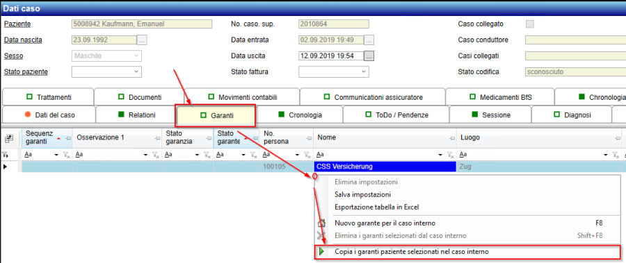 Die Übernahme von Garanten in den Fall ist gleich wie bei den Adressen. Es werden sämtliche Patientengaranten in grauer Schrift angezeigt. Diese können per rechtsklick in der Tabelle mit dem entsprechenden Kontextmenü-Eintrag übernommen werden:
