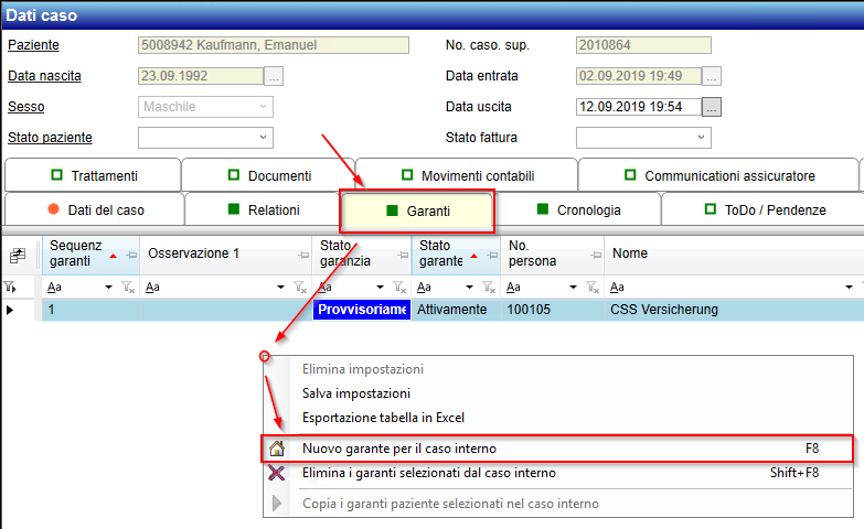 Gleich wie beim Patienten, können Garanten auch auf dem Fall erfasst werden. Das Prinzip ist dabei genau das gleiche: