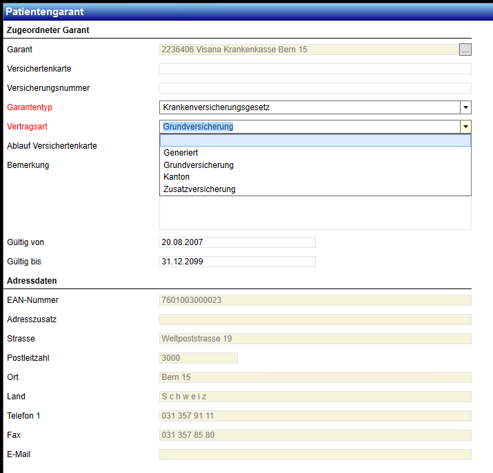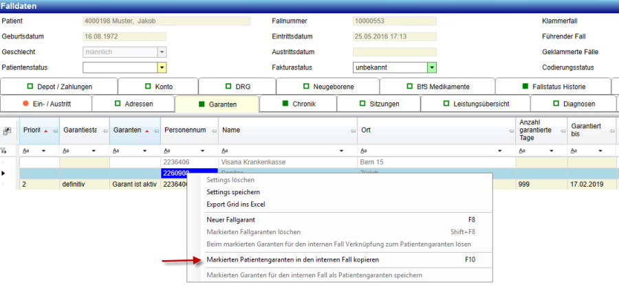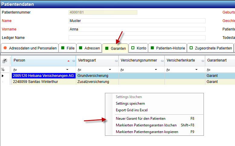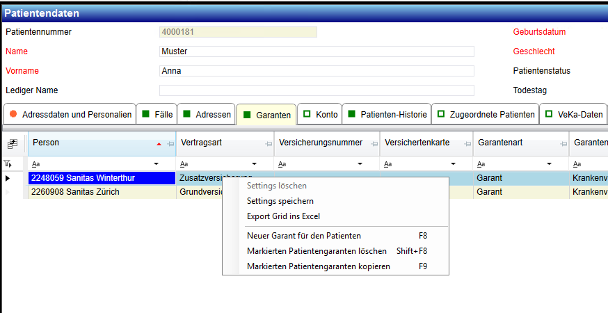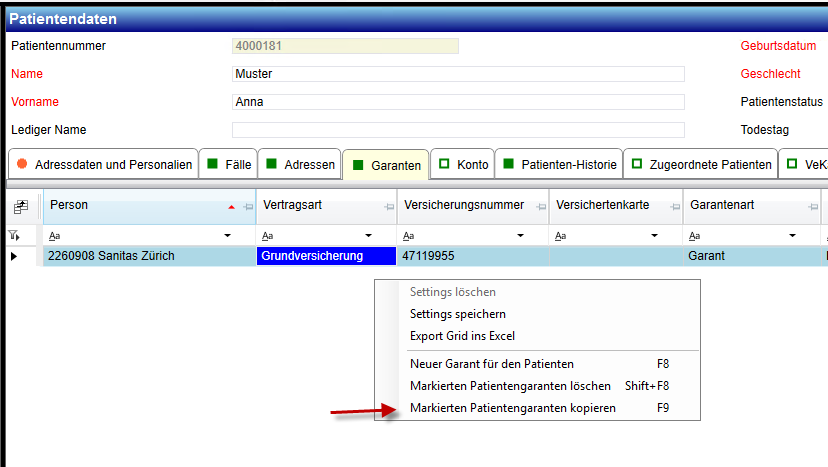 Ein Garant kann immer neu erfasst werden oder aber kopiert werden, falls dies Sinn macht. Wenn z.B. die Zusatzversicherung dieselbe Versicherung ist, wie die Grundversicherung. Hierzu kann auf dem Garanten rechte Maustaste Markierten Patientengaranten kopieren oder F9 gedrückt werden.