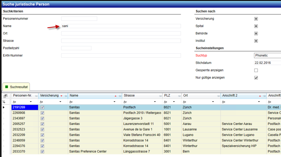 Suche juristische Person durchführen. Krankenkasse oder Unfallversicherung mittels Nummer oder Name suchen F4.
