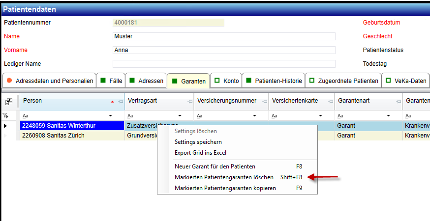 Um einen Garanten zu löschen, den Garanten markieren und mit rechter Maustaste Markierten Patientengaranten löschen oder Shift+F8 den Garanten löschen.