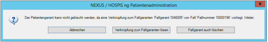 Fallgarant auch löschen = Der Garant wird auf dem Fall ebenfalls gelöscht. Gelöscht kann nur werden, wenn Fall noch nicht abgerechnet ist.