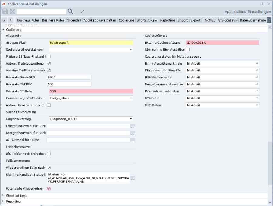 In den Applikations-Einstellungen kann definiert werden, welche Klammerkandidatenstatus in diesem Reiter sichtbar sind. Fälle mit abweichendem Hauptfallpauschalentyp könnten beispielsweise ausgeblendet werden, falls diese in dieser Ansicht nicht benötigt werden.