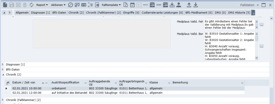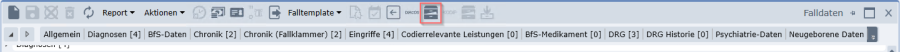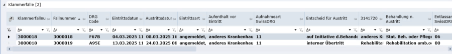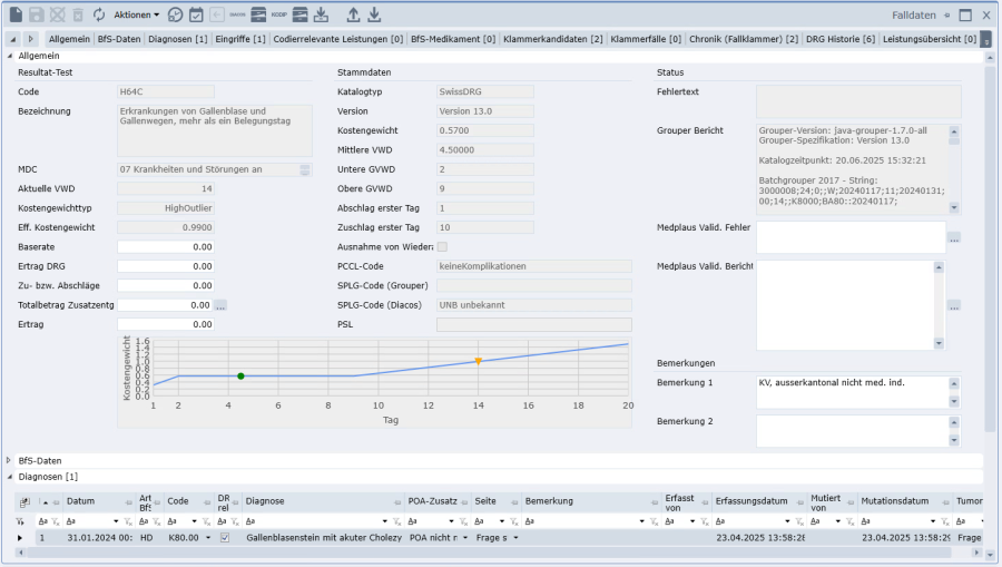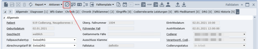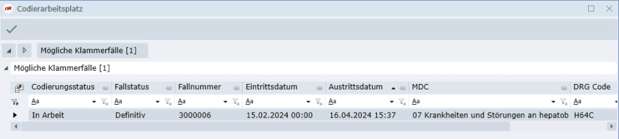 Der angeklammerte Fall selbst hat kein eigenes Grouperergebnis mehr und bleibt im Codierungsstatus «Abgeschlossen». Die Codierung des Einzelfalls vor der Klammerbildung ist in der DRG-Historie des jeweiligen Falles ersichtlich.