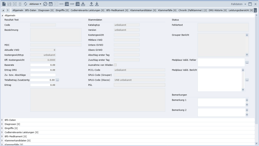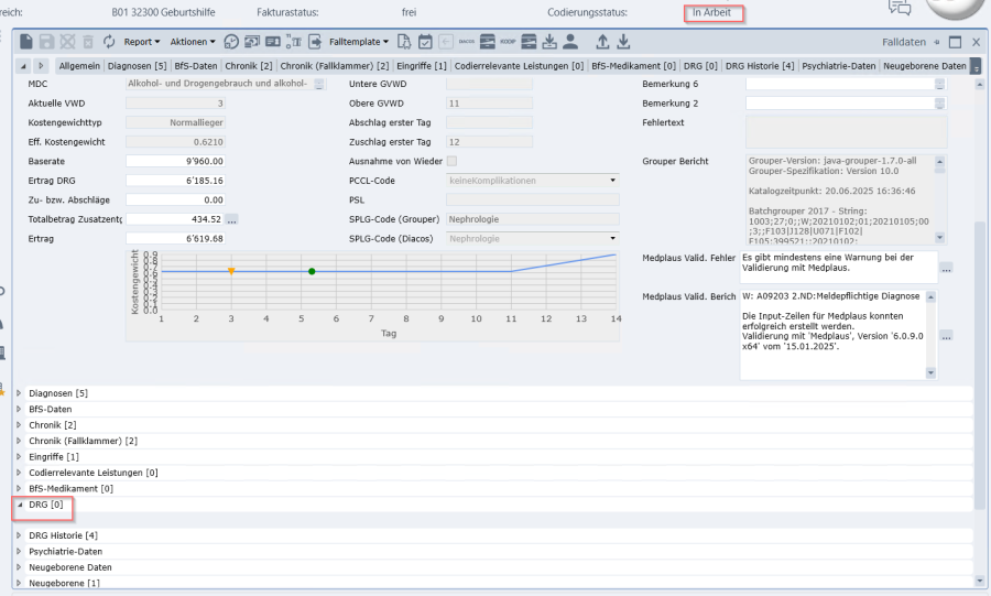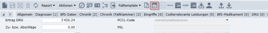 In beiden Stufen, wird das Grouperergebnis im Reiter «DRG» gespeichert und die codierrelevanten Felder sind für die weitere Bearbeitung gesperrt.