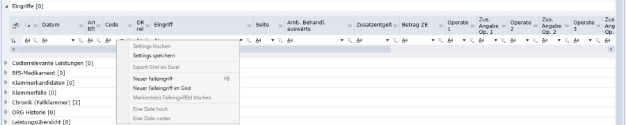 Neben den BfS-Medikamenten können weitere Leistungen im Stamm als codierrelevant gekennzeichnet werden. Diese werden dann im Reiter angezeigt und dienen dem Codierer als Hilfe, wenn anhand dieser erbrachten Leistungen z.B. CHOP-Codes codiert werden müssen, welche nicht automatisch ausgelöst werden.