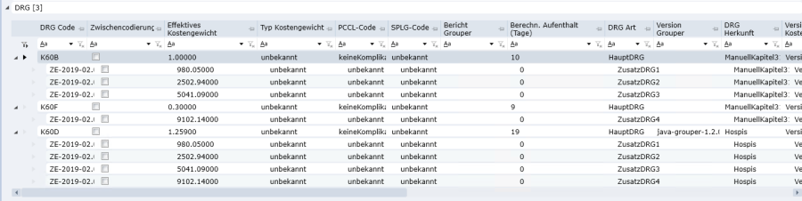 Mit Doppelklick auf den entsprechenden DRG/PCG/RCG Eintrag kann man in die Detailmaske wechseln. Dort findet man alle Details zu dieser DRG/PCG/RCG.
