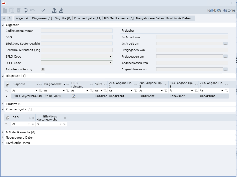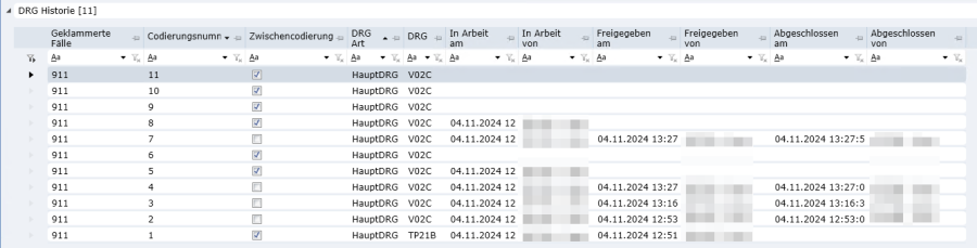Im Reiter «DRG-Historie» sind alle DRGs/PCGs/RCGs vorhanden, die entweder durch eine Zwischencodierung oder durch eine Freigabe, die wieder zurückgenommen wurde, erstellt wurden. Ausserdem findet man hier auch die DRGs/PCGs/RCGs von Einzelfällen vor einer Fallzusammenführung.