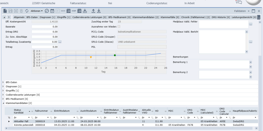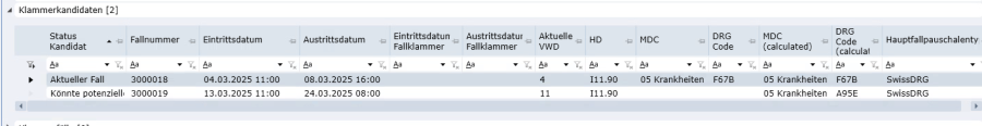 Die Fallklammer hat nach der Klammerbildung den Status «In Arbeit» und kann abschliessend codiert und freigegeben werden. In den Klammerkandidaten werden die beiden Fälle nun als Fallklammer dargestellt.