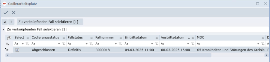 Bereits bei der ersten Freigabestufe eines Falles wird geprüft, ob es einen weiteren freigegebenen (erste Freigabestufe) oder abgeschlossenen (zweite Freigabestufe) Fall gibt, mit welchem der aktuelle Fall geklammert werden muss. Ist dies der Fall, wird folgendes Fenster geöffnet in welchem der Codierer den zu klammernden Fall selektieren muss.