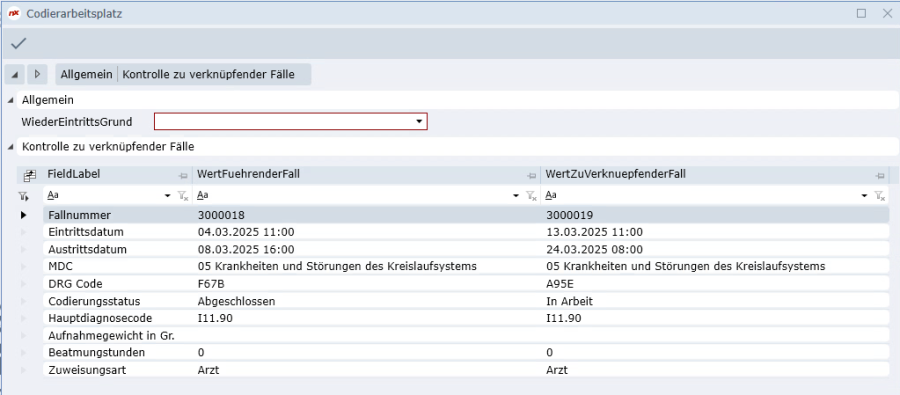Wurde der zu klammernde Fall ausgewählt erscheint folgendes Fenster zur Kontrolle der zu verknüpfenden Fälle und es muss noch der Wiedereintrittsgrund eingegeben werden.