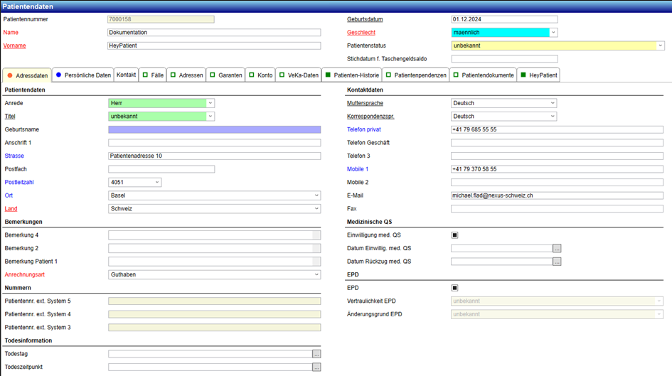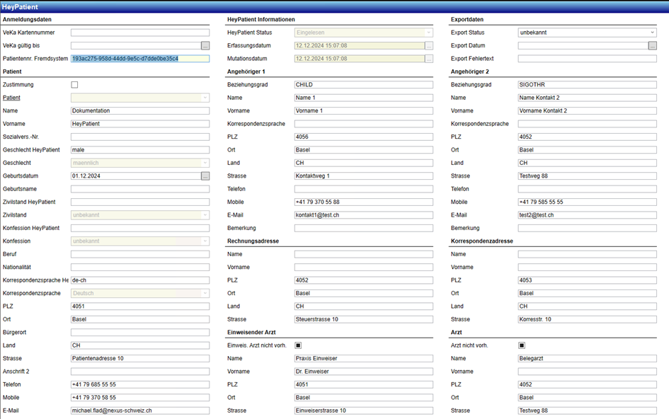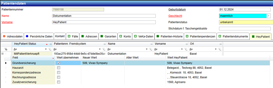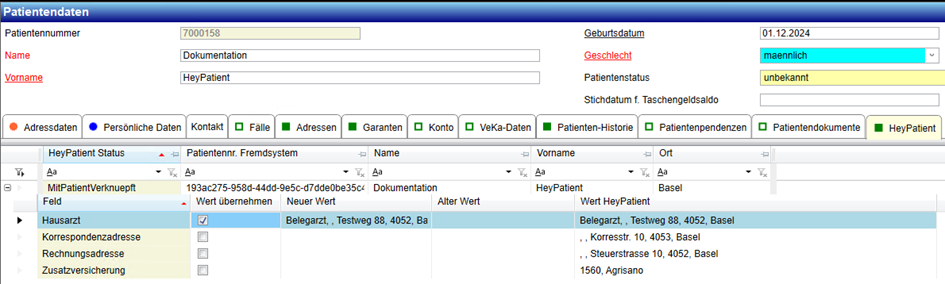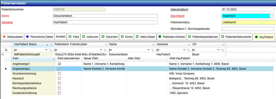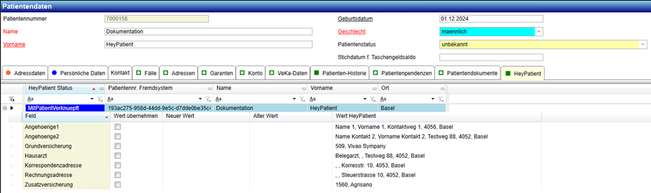 Für die zusätzlichen Daten steht ein separater Reiter "HeyPatient" zur Verfügung. Dabei kann mit dem Klick auf "Wert übernehmen" der Datensatz von der Anmeldung in NEXUS / PAT NG übernommen werden.