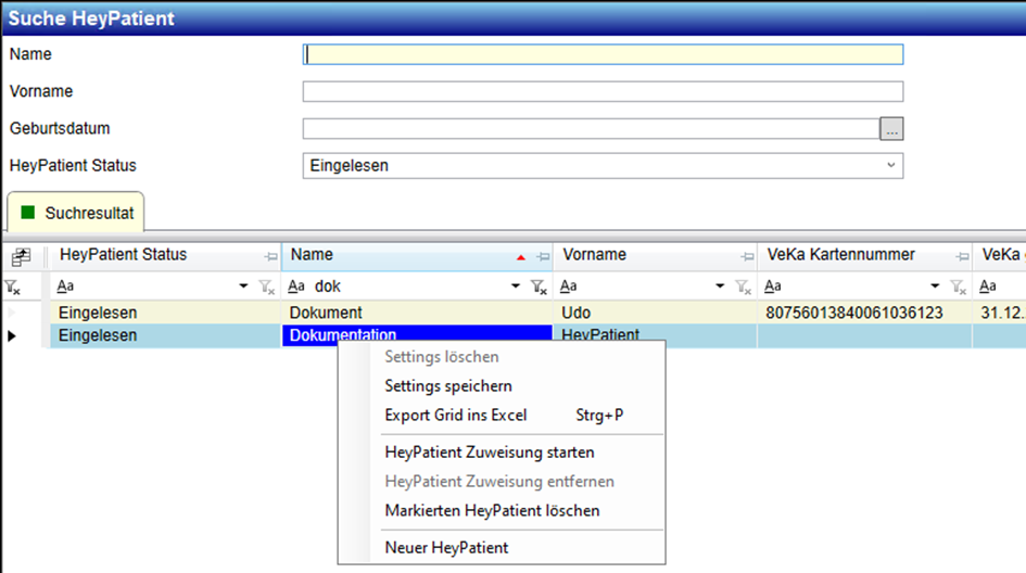 Standardmässig steht der HeyPatient Status auf "Eingelesen". Daher werden nur die offenen Datensätze angezeigt.