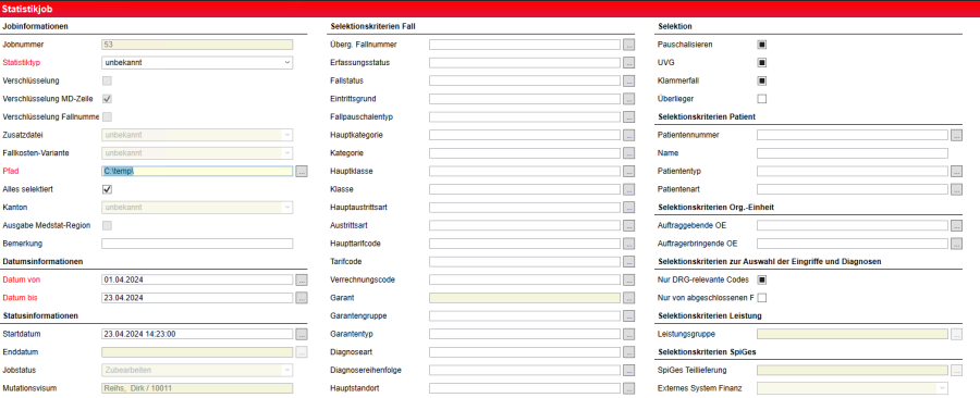 - Bei Statistikjobs mit 'Datum von' ab 1.1.2019 ist das Feld 'Klammerfall' deaktiviert und hat keine Relevanz. In die Dateien werden grundsätzlich alle Fälle einzeln ausgegeben. Fälle einer Fallklammer werden jeweils als Einzelfall ausgegeben. Dabei werden Diagnosen, Eingriffe und Fallpsychiatriedaten jeweils so ausgegeben wie deren letzter Zustand vor der Fallklammerung gewesen ist.
