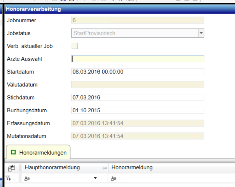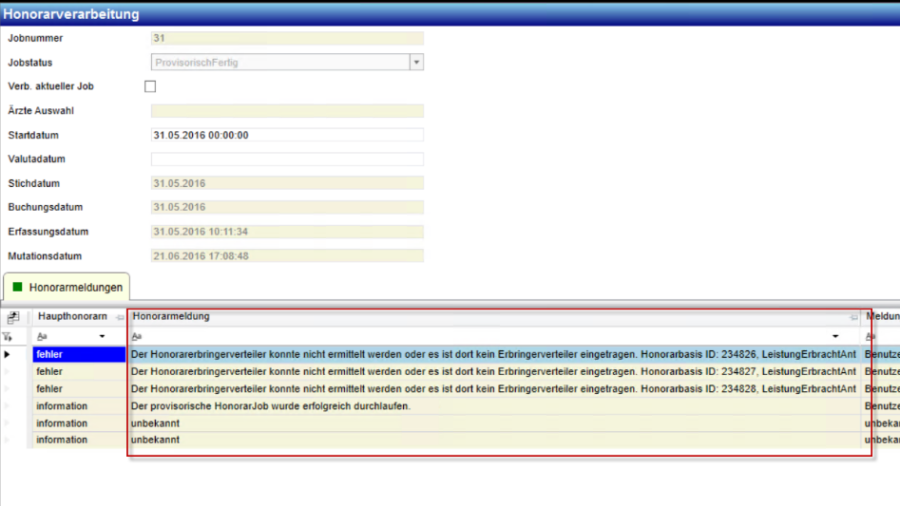 Fehler oder Meldungen aus dem Honorarlauf werden direkt auf dem Honorarlauf im Grid ausgegeben.