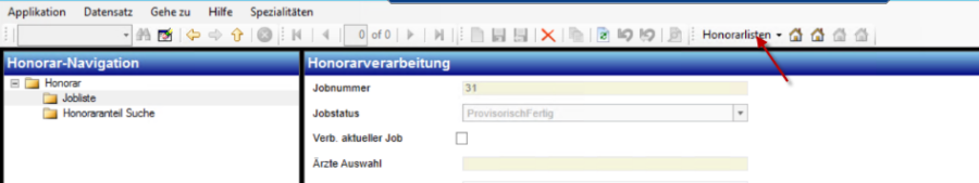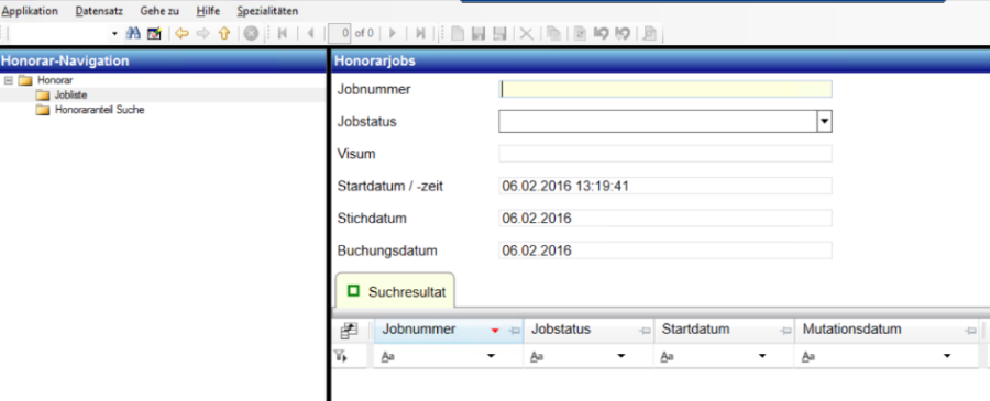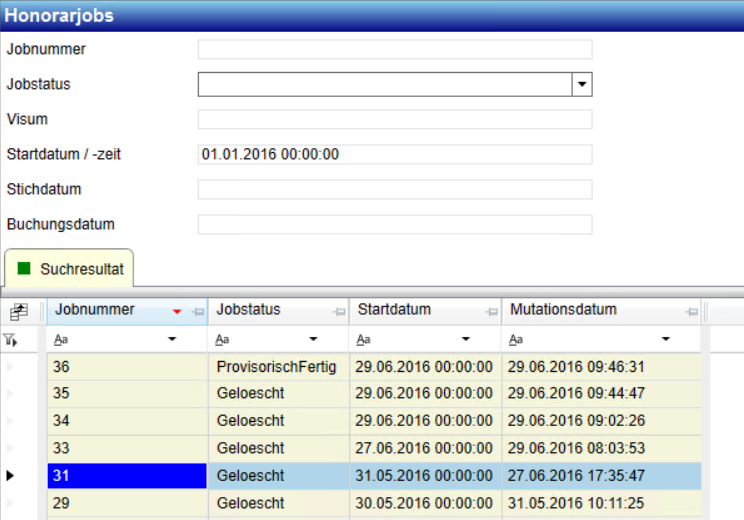 Falls der Honorarjob bereits erstellt, aber noch nicht ausgelöst wurde, kann dieser bei den Jobs wie folgt gesucht werden.