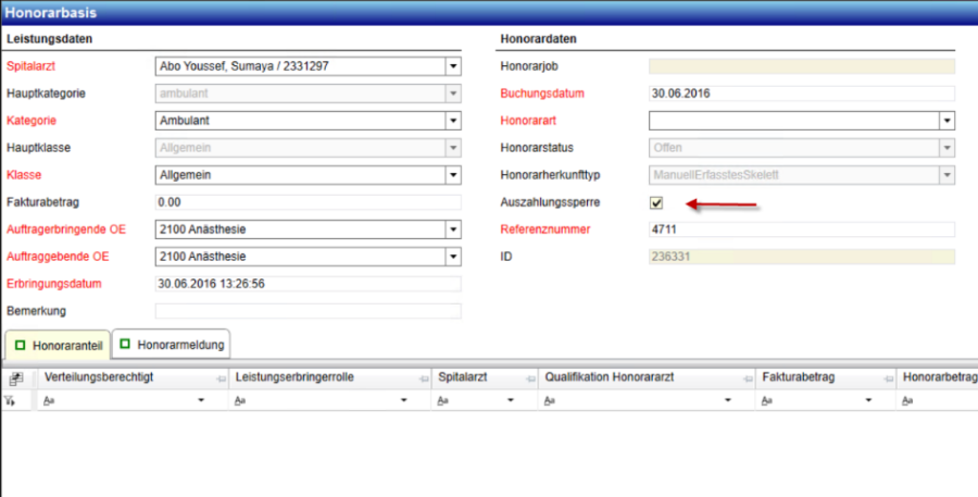Es können Honoraranteile gesperrt werden, indem eine Auszahlungssperre gesetzt wird. Die Weiterverarbeitung wird erst fortgesetzt, wenn die Auszahlungssperre wieder entfernt wurde.