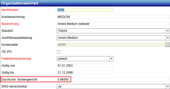 Für die Bewertung der uncodierten SwissDRG –Fälle wird ein durchschnittliches Kostengewicht der auftraggebenden Organisationseinheit (der aktuellsten Chronik) verwendet.
