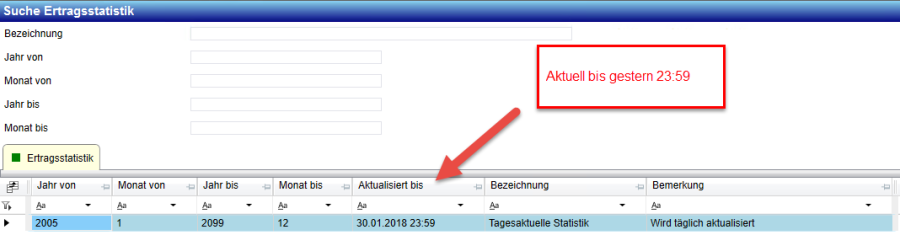 Dann kann ich als zusätzliche Kontrolle schauen, ob die Statistiken bis und mit gestern aktuell sind, ist das der Fall, so ist auch Job '0' erfolgreich durchgelaufen, denn die Statistik wird nur dann aktualisiert, wenn auch der Job '0' fehlerfrei gelaufen ist.
