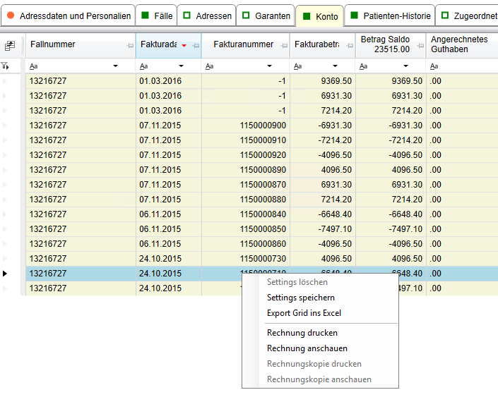 Der Reiter Konto gibt Auskunft über alle erstellten Rechnungen und Gutschriften. Mit der rechten Maustaste kann eine Rechnung resp. Rechnungskopie gedruckt oder angeschaut werden. Die sogenannte Saldoabfrage ist im Grid-Titel (Betrag Saldo) ersichtlich. Bei einem noch nicht abgerechneten Fall entspricht der Minusbetrag dem einbezahlten Depot.
