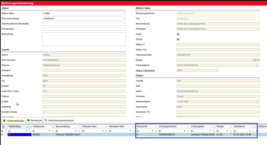 Bezieht sich die Rechnungsrückweisung auf eine Leistung, wurde bisher nur die 'Record-ID' aus dem XML angezeigt. Neu wird anhand der Record-ID die betroffene Leistung aus dem Rechnungs-XML ermittelt und Leistungsnummer und Erbringungsdatum in Rechnungsrückweisung angezeigt: