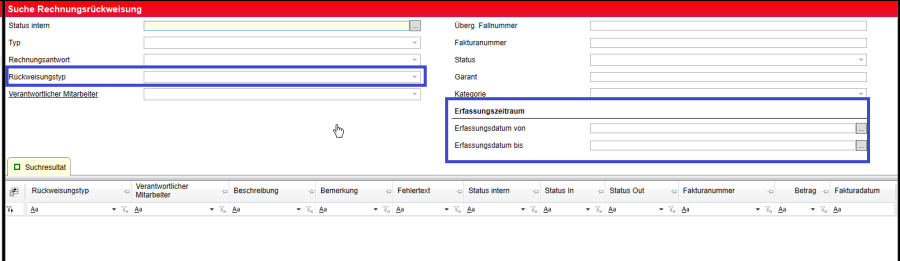 Abbildung 6 neue Suchfelder in den Rechnungsrückweisungen