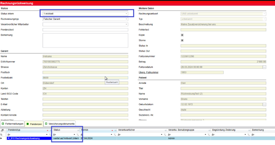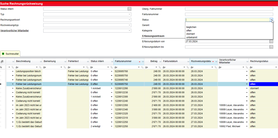 Die Suche und Anzeige der Rechnungsrückweisungen wurde erweitert, so dass die Daten besser dargestellt und bearbeitet werden können. Ausserdem ist es möglich, mehrere Datensätze zu selektieren, zu gruppieren und gemeinsam zu bearbeiten.