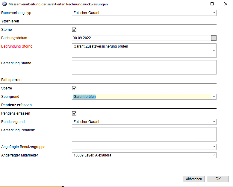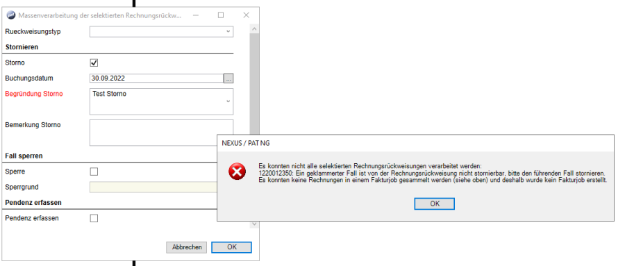 Hinweis: Rechnungsrückweisungen zu geklammerten Fällen können hier nicht für den Storno selektiert werden.